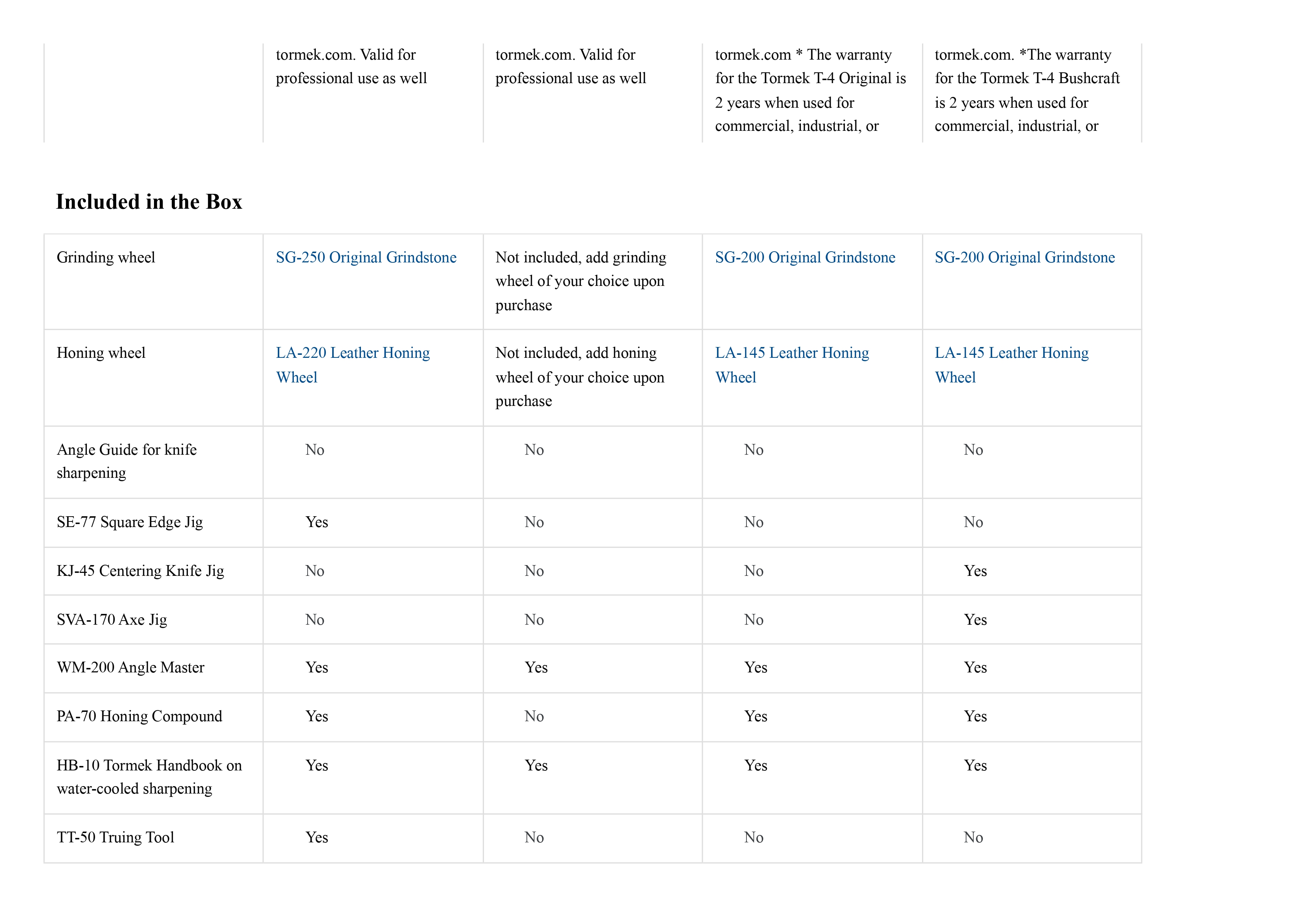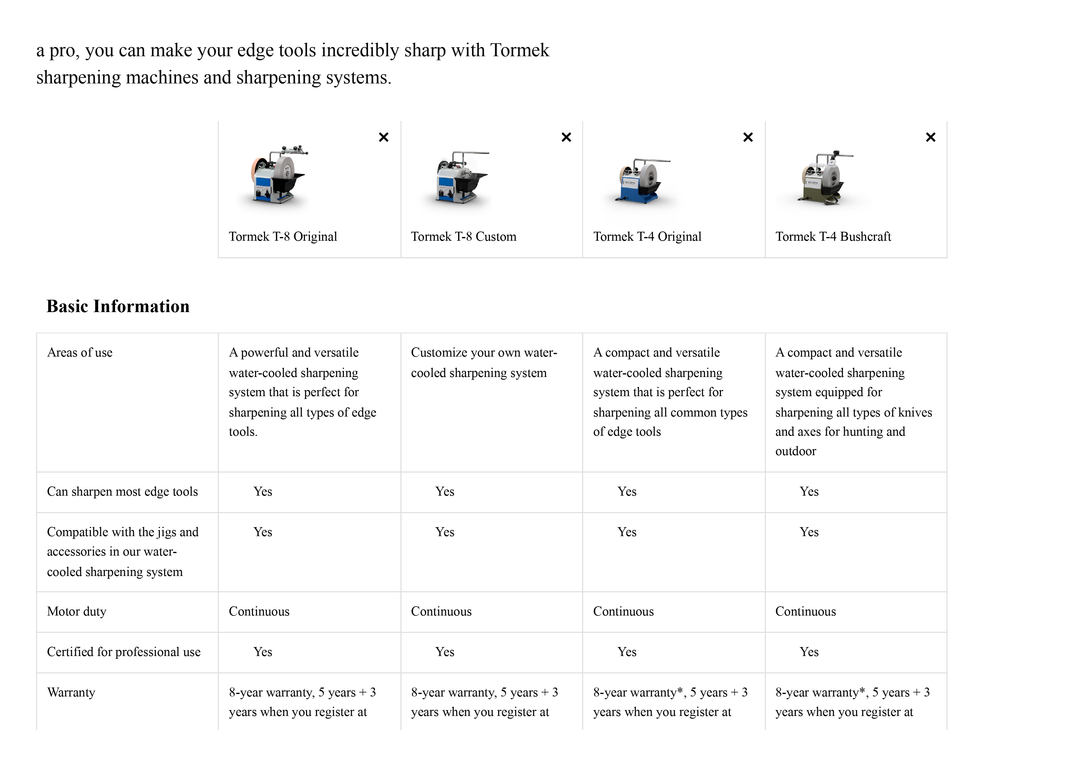 ตารางเปรียบเทียบเครื่องลับคมหล่อเย็นด้วยน้ำ TORMEK รุ่น T-8 Original, T-8 Custom, T-4 Original และ T-4 Bushcraft ว่าแตกต่างกันอย่างไร